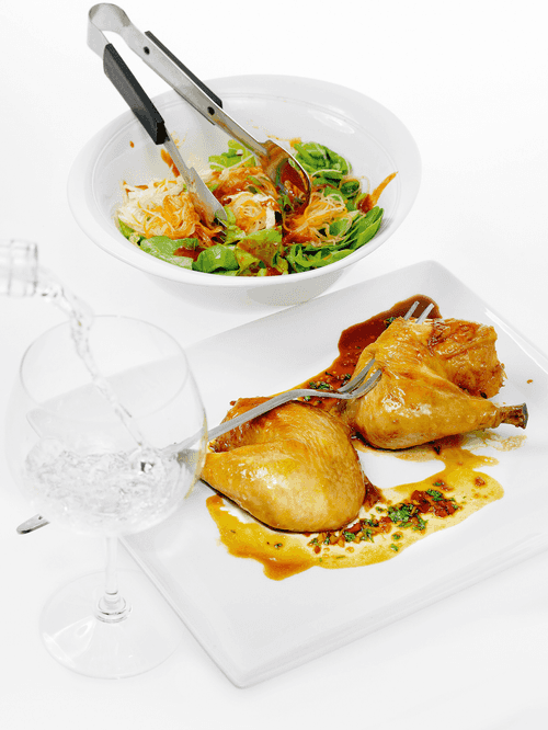 Глазированная в меду курица с салатом из латука, романо, пекинской капусты и кимчи
