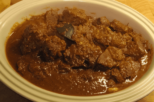 Влить заранее подготовленный бульон (примерно 250 мл), перемешать и варить на небольшом огне до готовности. Варить (а затем — тушить) придется долго, иногда помешивая. Если понадобится, можно добавить еще бульона или даже сливок (для тех, кто может себе позволить жирную пищу). Мясо должно стать нежным, жидкость — выпариться, оставив густой немного неоднородный кирпично-коричневый соус.