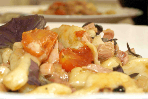 Картофельные ньокки (клецки) с помидорами черри и копченой курицей