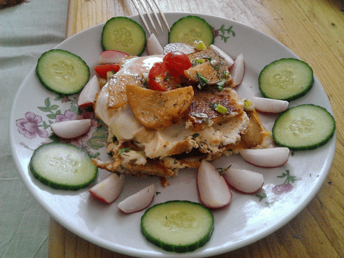 Выложите на тарелку, украсьте овощами.