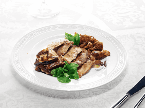 Выложить на тарелки мусс из пастернака вместе с белыми грибами, рядом — лисички и крупно нарезанное мясо цесарки. Посолить, поперчить, украсить салатом корн.