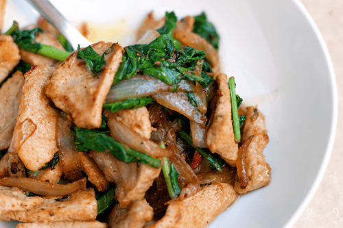 Жареная свинина с мангольдом — это яркое и сочное блюдо европейской кухни, сочетающее нежность мяса и свежесть зелени. Исторически блюда из свинины широко распространены в европейских кулинарных традициях, где ценится насыщенный вкус и простота приготовления. Обжаренная до золотистого цвета корейка пропитывается ароматами сладкого лука, острого чили и пикантного рыбного соуса. Легкая горечь мангольда придаёт блюду сбалансированность и свежесть. Это блюдо прекрасно подходит как для уютных домашних ужинов, так и для праздничных застолий. Подача его возможна как самостоятельного блюда или в сочетании с гарнирами — например, с рисом или картофельным пюре. Уникальное сочетание специй и текстур делает его насыщенным и запоминающимся.