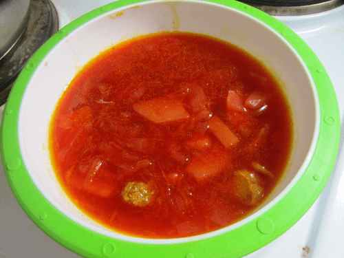 Как все будет готово, добавить бульон (и мясо) или воду в пропорции 2:1 к заправке, посолить, поперчить, через примерно 30 минут, как суп начнет закипать, добавить 1/3 свеклы и чеснок (сначала надавить ножом, потом мелко нарезать). Далее добавить сок из настоявшейся свеклы — это добавить красный цвет супу, добавить мелко нашинкованную зелень.