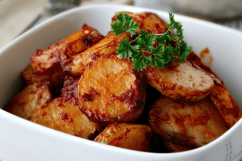 Пататас бравас — одно из самых популярных блюд испанской кухни, особенно в Мадриде. Это пикантное, ароматное блюдо, в котором нежный картофель сочетается с насыщенным острым соусом. Его происхождение связано с традиционными испанскими тапас — небольшими закусками, которые идеально подходят для дружеских встреч. Запеченные кусочки молодого красного картофеля приобретают аппетитную золотистую корочку, а соус из томатов, паприки и кайенского перца дарит насыщенный вкус с пикантными нотками. Винный уксус добавляет легкую кислинку, сбалансированную оливковым маслом. Пататас бравас идеально сочетается с бокалом испанского вина или холодным пивом, а также служит превосходным гарниром к мясным и рыбным блюдам. Это настоящая кулинарная классика, которая пробуждает страсть к испанской гастрономии!