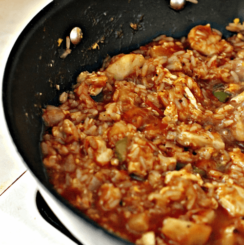 Минут пять жарим и добавляем мелко нарезанную (или крупно) курицу. Увеличиваем огонь.