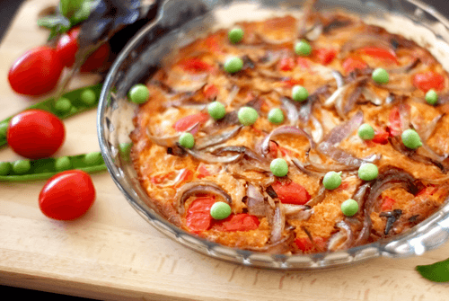 Омлет с чоризо, овсяным молоком, помидорами черри нужно сразу подавать на стол, украсив зеленым горошком.
