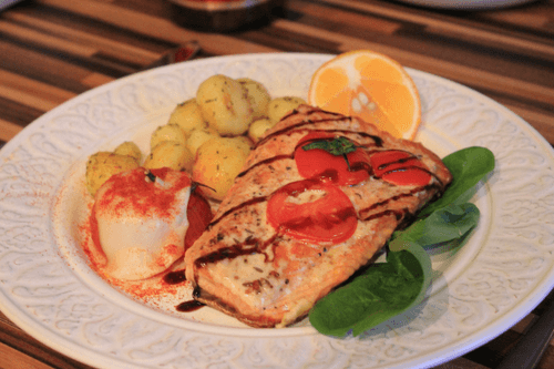 Шотландский лосось с томатами под копченым сыром в сладкой паприке — блюдо, воплощающее богатые традиции шотландской кухни. Лосось, основа местных гастрономических традиций, приобретает выразительный вкус благодаря лимонному и апельсиновому соку. Томаты, подвергшиеся бланшировке, приобретают нежность, а копченый сыр привносит глубокий аромат с лёгкой дымной ноткой. Завершающий штрих — сладкая паприка, которая добавляет теплоту и лёгкую пряность. Блюдо гармонично сочетается с молодым обжаренным картофелем, делая его идеальным выбором для праздничного или уютного домашнего ужина. Сочетание нежности рыбы, свежести цитрусов и пикантности специй создаёт незабываемую палитру вкусов, достойную истинных гурманов.