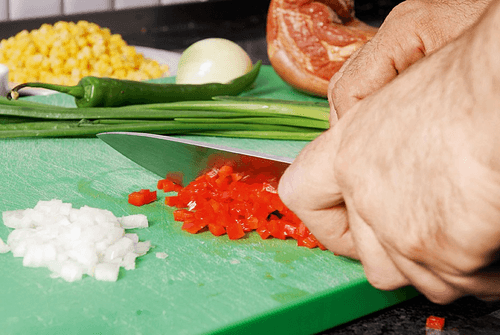 Нарезать мелкими кубиками репчатый лук, острый и сладкий перец, у которого нужно срезать всю белесую внутренность, чтобы осталась практически одна кожа с тонкой прослойкой мякоти. Чеснок нарезать тонкими пластинками, зеленый лук — не слишком крупно, но и не слишком мелко, средне.