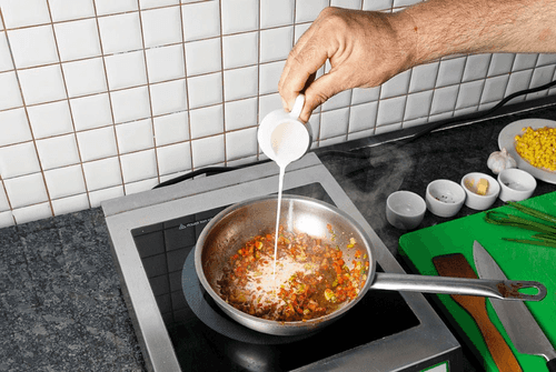 Через 2 минуты добавить к грудинке и бекону острый и сладкий перец, репчатый лук и чеснок. Щедро посыпать креольской приправой, обжарить, помешивая, до полуготовности овощей — после чего влить сливки и перемешать.