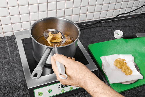 Разогреть в сотейнике масло для фритюра, когда оно закипит, положить кусочки сома, а через 1–1,5 минуты вынуть шумовкой и откинуть на бумажное полотенце, чтобы избавиться от масла.