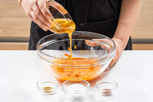 Смешать облепиховое пюре, мед, карри, перец и соль.
