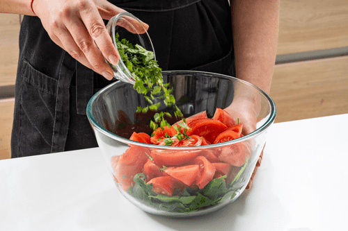 Для гарнира нарезать помидоры дольками. Смешать со шпинатом и листьями мяты.