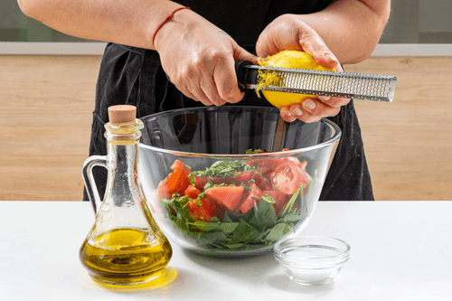 Добавить к салату оливковое масло, цедру и сок лимона, посолить по вкусу.