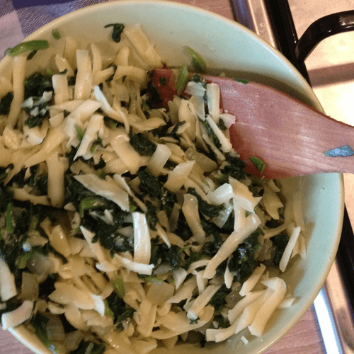 В остывший шпинат добавить натертый сыр, соль и специи.
