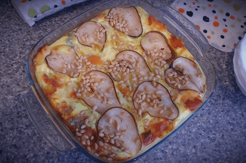 Выложить массу на начинку, посыпать тертым пармезаном. Украсить грушами и кедровыми орехами.