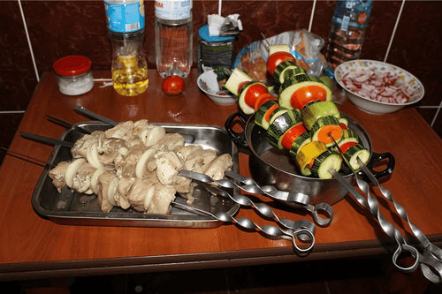 Вынуть мясо, перемешать его с луком, добавить 2 соловые ложки постного масла и еще раз перемешать. Довольно плотно нанизать на шампуры и жарить на мангале до готовности.