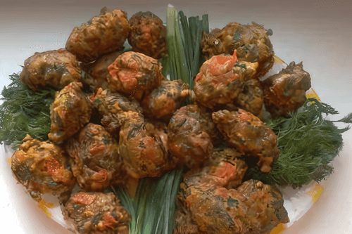 Мокрыми руками лепим маленькие шарики из помидорно-мучной массы и обжариваем их во фритюре до ярко-оранжевого цвета.