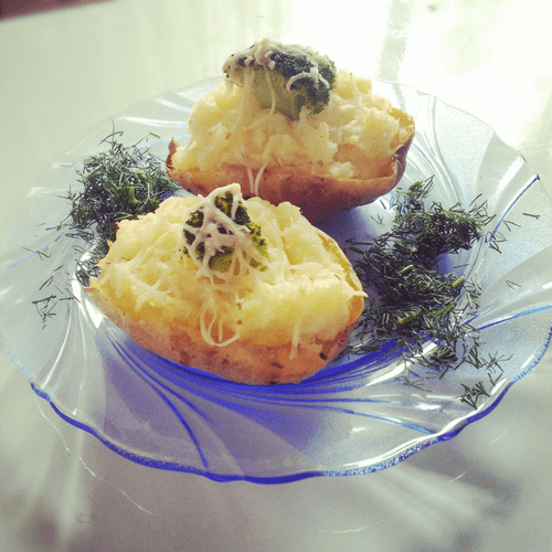Заполняем половинки картофеля, сверху на каждую кладем брокколи и посыпаем тертым сыром.