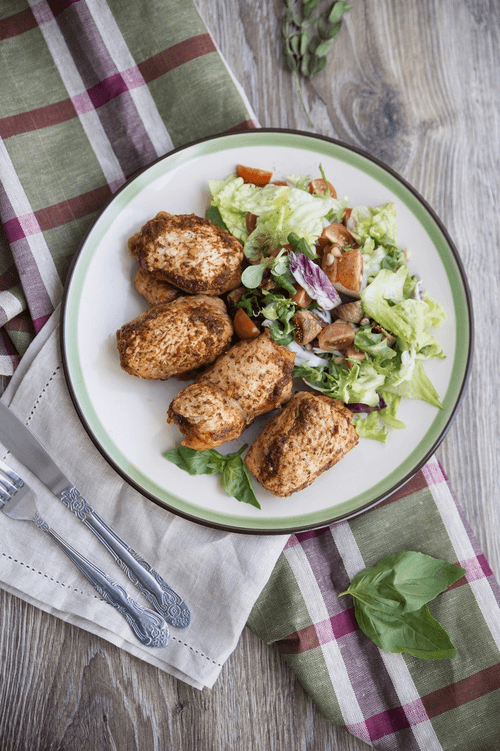 Филе индейки промыть, разрезать вдоль волокон на порционные куски толщиной 1 см, отбить до толщины 0,5 см, посыпать солью и специями.