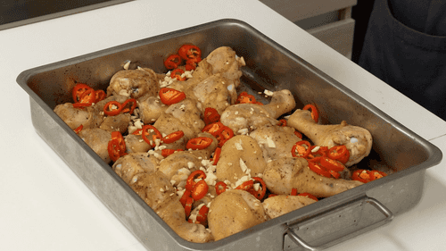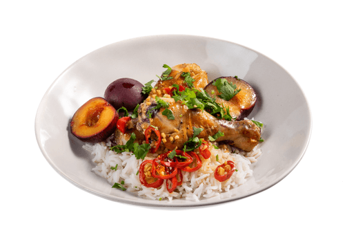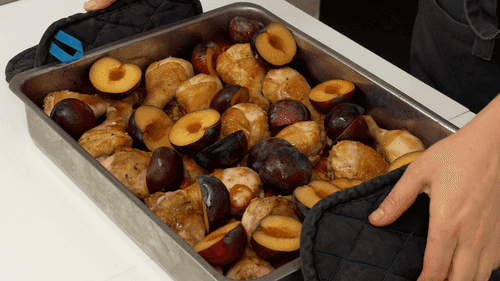 Интересный метод запекания куриных голеней, который не так очевиден. Процесс можно разделить на три основные стадии. В начале готовки голени обжариваются с добавлением масла, соли и перца. После этого к ним добавляют имбирь и перец чили. В завершение, за 15 минут до окончания приготовления, курица запекается под слоем слив — их кисло-сладкая нотка прекрасно дополнит вкус мяса. Для уменьшения остроты, рекомендуется удалить семена и белые прожилки из чили.