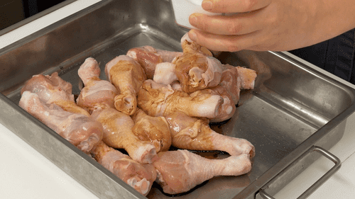 В миске перемешать куриные голени с маслом, соевым соусом, солью и перцем. Выложить на противень и отправить в духовку, разогретую до 200 градусов, на двадцать пять минут.