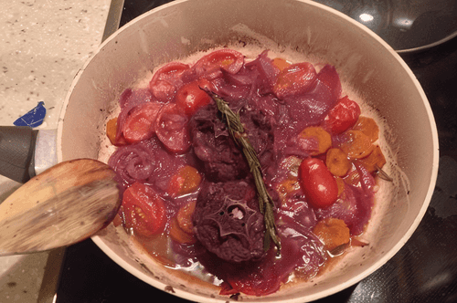 Возвращаемся к нашей баранине. Количество жидкости должно было уменьшиться примерно вдвое. Опускаем туда розмарин и тимьян, а затем (именно в этом порядке) — морковь, через 2 минуты — болгарский перец, через минуту — лук, и еще через 1,5–2 минуты — помидоры. Тушить все до готовности.