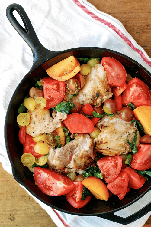 Выложить овощи и курицу, сбрызнуть оливковым маслом. Запекать при 200 градусах 30 минут.
