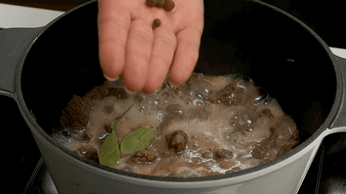Добавить соль и специи. Далее продолжать тушить говядину на маленьком огне под крышкой еще 1 час.