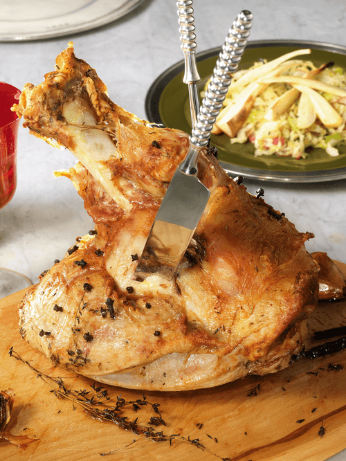 После чего сделать на окороке надрезы в форме решетки, в каждую решетку воткнуть по гвоздике. Уложить окорок на противень и поставить в духовку, разогретую до 230 градусов, на пятнадцать минут, после чего уменьшить огонь до 120 и держать так еще два часа. В конце увеличить до 180 градусов и через двадцать минут вынуть окорок из духовки.