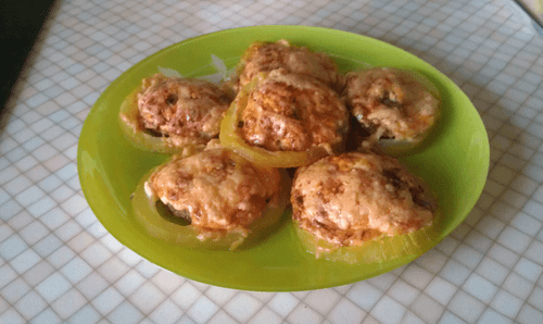 Противень смазать подсолнечным маслом, выложить колесики, наполнить их до краев смесью из фарша, лука и перца, сверху посыпать тертым сыром.