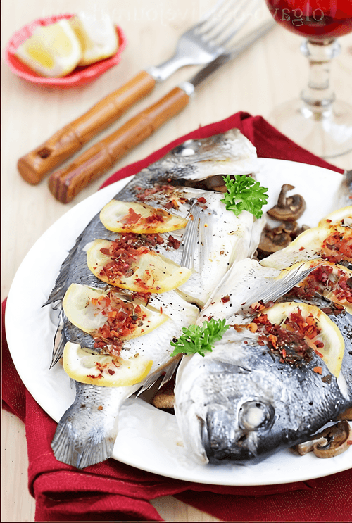 Дорада с грибами, приготовленная на пару
