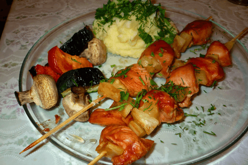 Куриный шашлык по-домашнему с грибами и ананасами – это удивительное сочетание грузинских традиций и современного вкуса. Благодаря маринаду из соевого соуса и кетчупа мясо приобретает насыщенный вкус, а добавление ананаса придаёт пикантную сладость. Грузинская кухня известна своим искусным балансом между специями и натуральными ингредиентами, и этот шашлык – прекрасное тому доказательство. Запекание в духовке сохраняет сочность куриного филе, а овощи и шампиньоны дополняют блюдо свежестью и ароматом. Такой шашлык станет отличным выбором для семейного ужина или праздничного застолья, где каждый кусочек наполнен гармонией вкуса. Подавать его можно с грузинскими соусами, свежей зеленью и бокалом лёгкого белого вина.