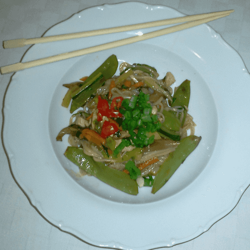 Тайская рисовая лапша с курицей и овощами