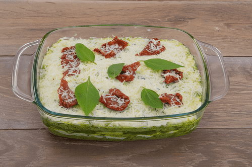 Овощная лазанья из цукини с рикоттой и соусом песто – это изысканное и легкое блюдо, вдохновленное средиземноморской кухней. В этой интерпретации классической лазаньи вместо пасты используются тонкие пластинки запеченного цукини, которые придают блюду свежесть и нежную текстуру. Сыр рикотта, соединяясь с ароматным пармезаном и зеленью, создает кремовую начинку, а соус песто, богатый базиликом и кедровыми орехами, наполняет лазанью насыщенным вкусом. Вяленые помидоры добавляют пикантные ноты, придавая блюду баланс сладости и кислинки. Эта лазанья идеально подходит для летнего ужина или легкого обеда, оставаясь одновременно питательной и изысканной. Ее можно подавать как теплым, так и охлажденным, наслаждаясь всеми нюансами вкуса в каждом кусочке.