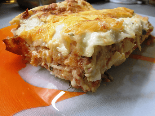 Когда соус бешамель загустел, сразу собираем лазанью. Дно формы смазать маслом, уложить на дно сухие листы лазаньи (кол-во листов зависит от формы, в которой будет готовиться ваша лазанья), на них — слой фарша, затем заливаем соусом бешамель, посыпаем тертым сыром. Слои чередуем до заполнения формы (у меня получается 3 слоя). Последний слой (4-й) — листы лазаньи, соус бешамель, тертый сыр.