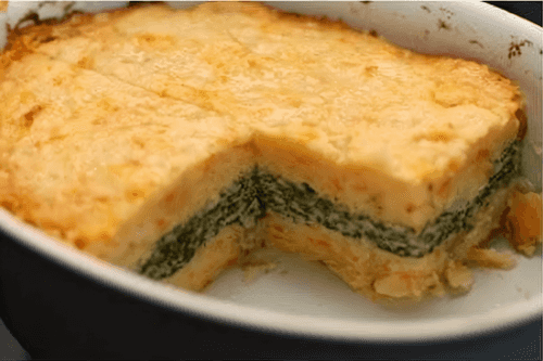 В смазанную маслом форму для выпечки выложите половину картофельно-морковного пюре, разровняйте. Выложите смесь со шпинатом и курицей. Сверху положите оставшееся пюре, разгладьте поверхность и разложите по поверхности кусочки сливочного масла.