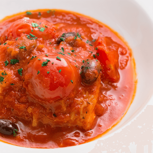 Треска, запеченная с оливками и томатами — это настоящее воплощение средиземноморского вкуса, наполненного яркими нотками свежих трав, томатов и оливок. Этот рецепт уходит корнями в европейскую кухню, где ценят баланс между насыщенными ароматами и нежной текстурой рыбы. Золотистая корочка филе трески, пропитанная пикантным соусом наполи, обогащается тонкими оттенками каперсов, чеснока и белого вина. Приготовленный таким образом, этот рыбный шедевр раскрывает всю глубину вкуса морепродуктов, а свежие томаты черри и рубленая петрушка придают блюду дополнительную свежесть. Подавать его лучше всего с легкими гарнирами, такими как молодые овощи или кусочек хрустящего багета, который отлично впитает ароматный соус. Это блюдо — идеальный выбор для тех, кто ищет гармонию изысканности и простоты.