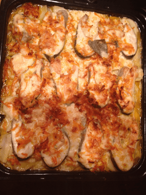 Картофель нарезаем кружочками средней толщины. Укладываем в форму, добавляем соль, перец и немного растительного масла. Сверху на картошку выкладываем рыбу, слегка присолив ее, на рыбу — морковь с луком и сверху выкладываем чесночный соус.