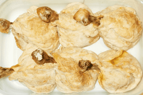 Тесто раскатать, разрезать на квадратики по количеству куриных ножек.