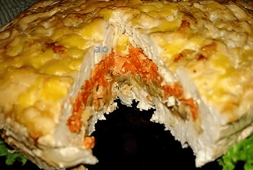 Сверху уложить по спирали кусочки оставшегося мяса.