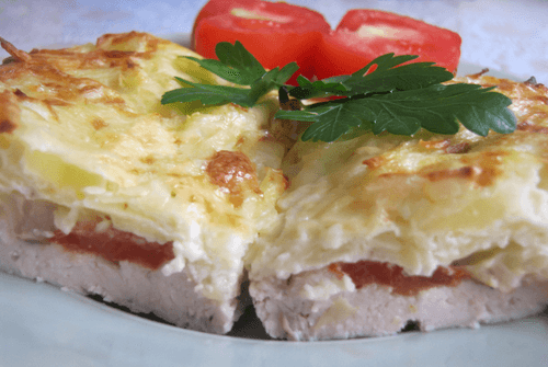 Запечь в духовке до появления золотистой корочки. Разрезать на порции и подавать.