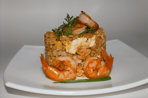 Креветок перед отправкой на сковородку полить соевым соусом. Перемешать с рисом, стараясь всех креветок закопать в него, как можно глубже. После этого им надо буквально 30 секунд, чтобы порозоветь — а это значит, они готовы и можно раскладывать рис по тарелкам.