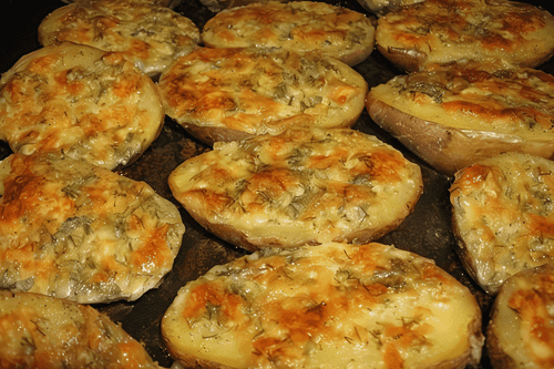 Все перемешиваем, приправляем молотым перцем и, если нужно, то солью. Картошку разрезаем вдоль, кладем на смазанную маслом форму. Намазываем на каждую картошину чесночное масло и ставим в разогретую до 250 градусов духовку. Время готовки 10–15 минут.