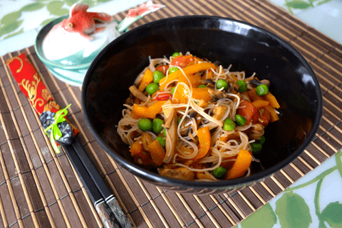 Рисовая лапша с овощами и соусом терияки — это изысканное блюдо паназиатской кухни, которое объединяет свежесть овощей, нежность грибов и ароматный вкус терияки. Его корни уходят в традиции восточной гастрономии, где легкость и насыщенность вкуса всегда гармонично сочетаются. Гладкая структура рисовой лапши прекрасно впитывает сладковато-соленые нотки соуса терияки, создавая восхитительную симфонию вкусов. Обжаренные грибы, хрустящий перец и нежные помидоры черри наполняют блюдо яркими красками и текстурой, а зеленый горошек добавляет легкую сладость. Кунжут завершает композицию, придавая мягкий ореховый акцент. Это блюдо идеально подходит как для повседневного ужина, так и для особого случая, подчеркивая утонченность азиатской кухни.
