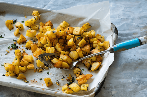 В большой миске смешать картофель с двумя столовыми ложками оливкового масла и солью. Распределить картофель по двумя противням, застеленным пергаментной бумагой. Поместить противни в духовку и запекать в течение 40 минут до золотистой корочки, один раз перемешав.
