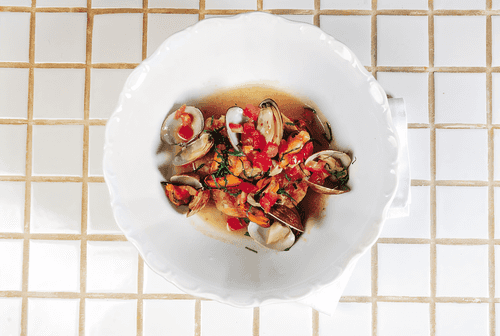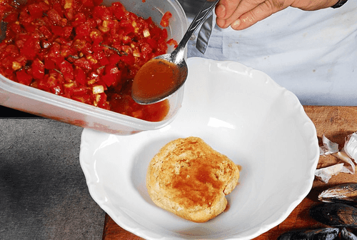 Положить сухарь в глубокую тарелку и залить помидорным соком. Время от времени собирать сок ложкой со дна тарелки и поливать хлеб — когда мидии будут готовы (на это уйдет минут семь), он уже достаточно размягчится, чтобы его было приятно есть, но останется хрустящим внутри.