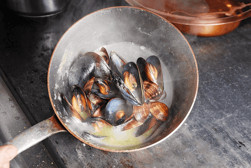 Чеснок размять ножом. Плеснуть в сотейник часть масла, положить чеснок, стебли петрушки и несколько колечек острого перца и поставить на огонь. Когда сильно запахнет чесноком, бросить в сотейник ракушки, накрыть крышкой и готовить, потряхивая или перемешивая содержимое. Через несколько минут мидии раскроются и выпустят ароматную морскую воду.