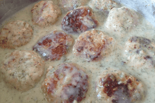 В горячее молоко добавить столовую ложку муки (чтобы подлива получилась не жидкая) и зелень. Залить этой смесью готовые котлеты и тушить на мелком огне 5 минут.
