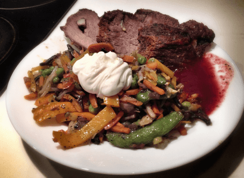 Снимаем с огня овощи и подаем их со сметаной и кусочком мяса, к мясу я еще добавляю сацибели.