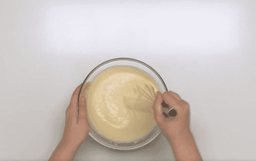Первым делом приготовим кляр: в большую посудину насыпаем муку, к ней разбиваем яйца и заливаем туда молоко, перемешиваем, пока кляр не станет однообразной консистенции, обязательно без комков. Он должен получится не слишком густой и не слишком жидкий. После того, как все комки убиты, солим щепоткой соли и добавляем шепотку перца (для любителей экзотики, можно добавить сухой карри, будет пряный кляр).